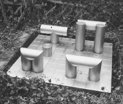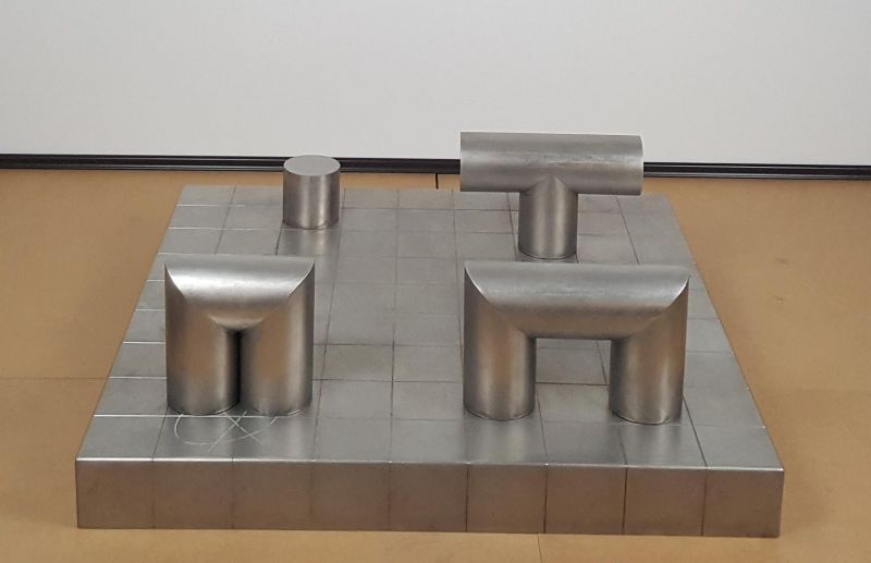 B1 - Konstrukteure künstlerischer Form, Märkisches Museum Witten, Witten, Deutschland, 16. Februar–22. September 2019., wie Röhrenlandschaft auf gerastertem Sockelfeld.